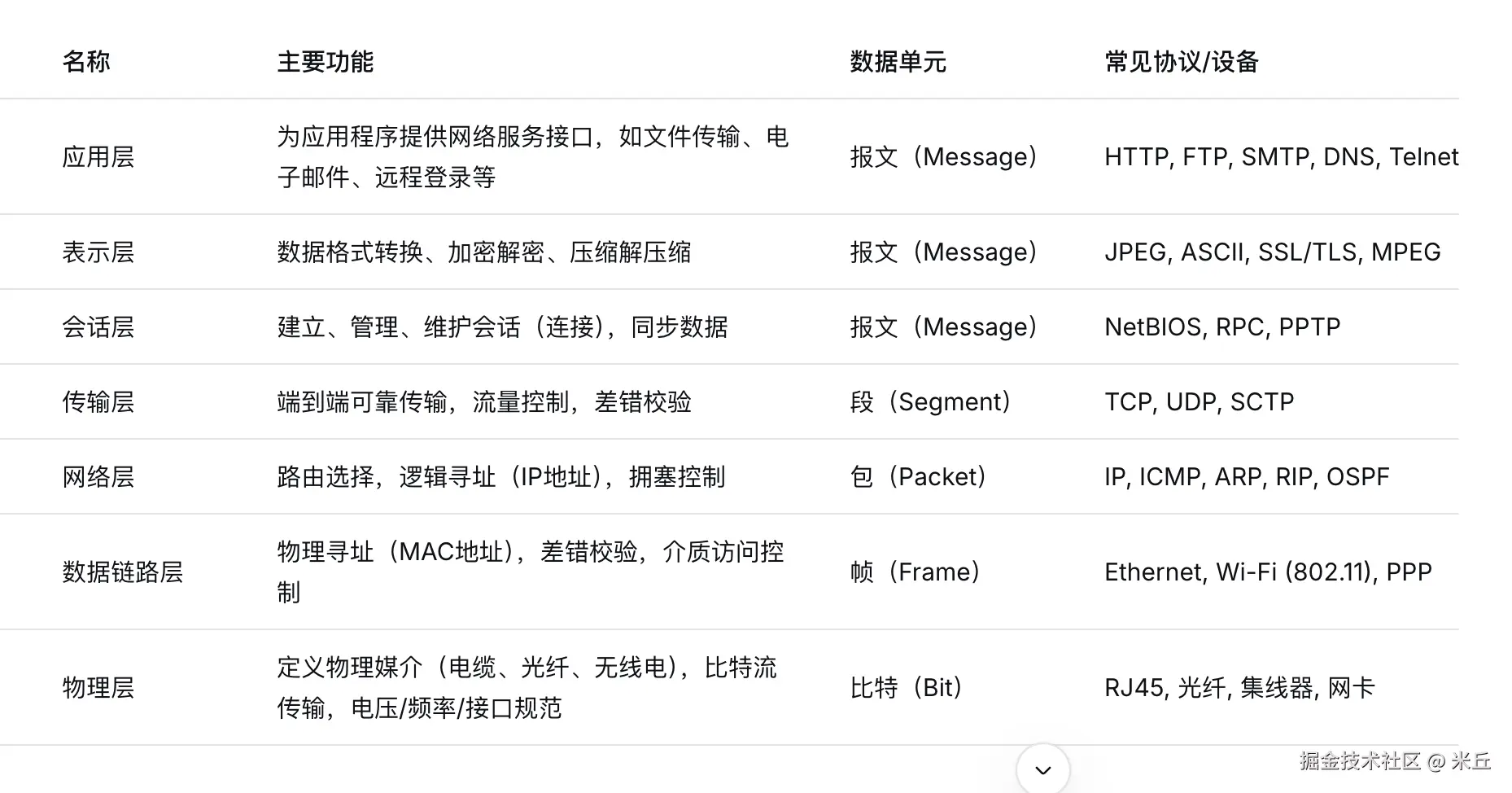 | 网络层 | IP | 路由和寻址(Node.js 中不直接暴露)。 |