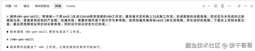 老规矩,看到下图中n8n-gen-skill前面有绿灯,才证明是正在使用skill