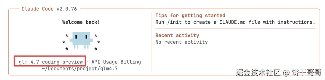 配置完成后,当你再次进入 Claude Code,你会看到底层的驱动引擎已经换成了 glm-4.7-coding-preview。