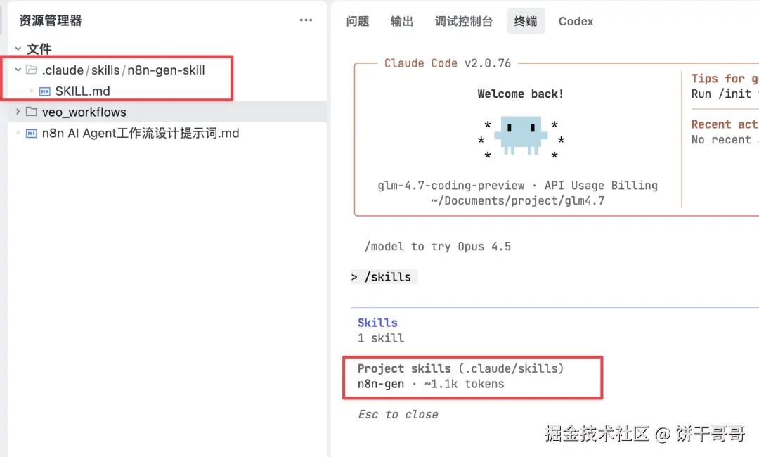 Claude Code会自动读取里面的skill文件夹,例如n8n-gen-skill