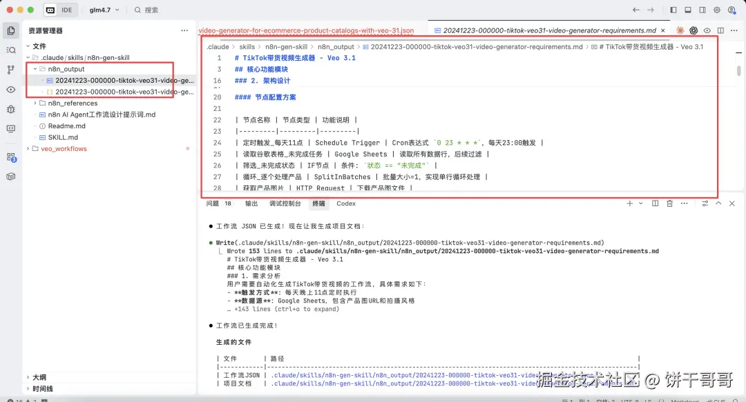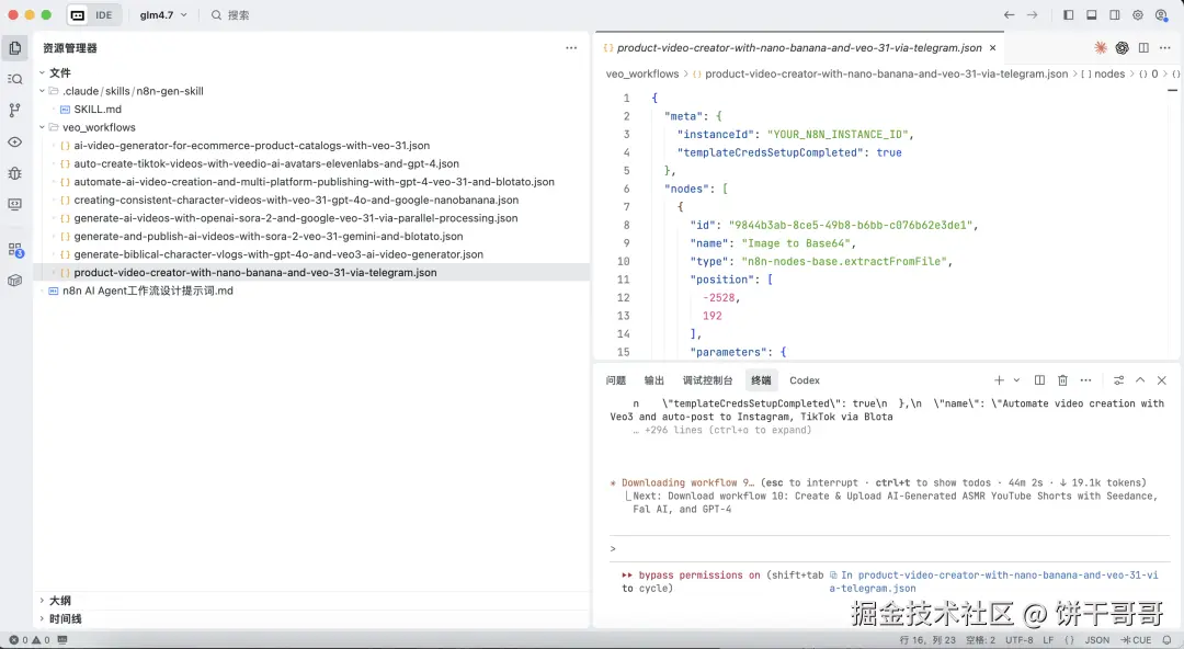 卧槽,牛逼!看来这个逻辑是对的,如图左边已经自动新建好了veo_workflows文件夹并且已经有了9个n8n工作流json文件了。