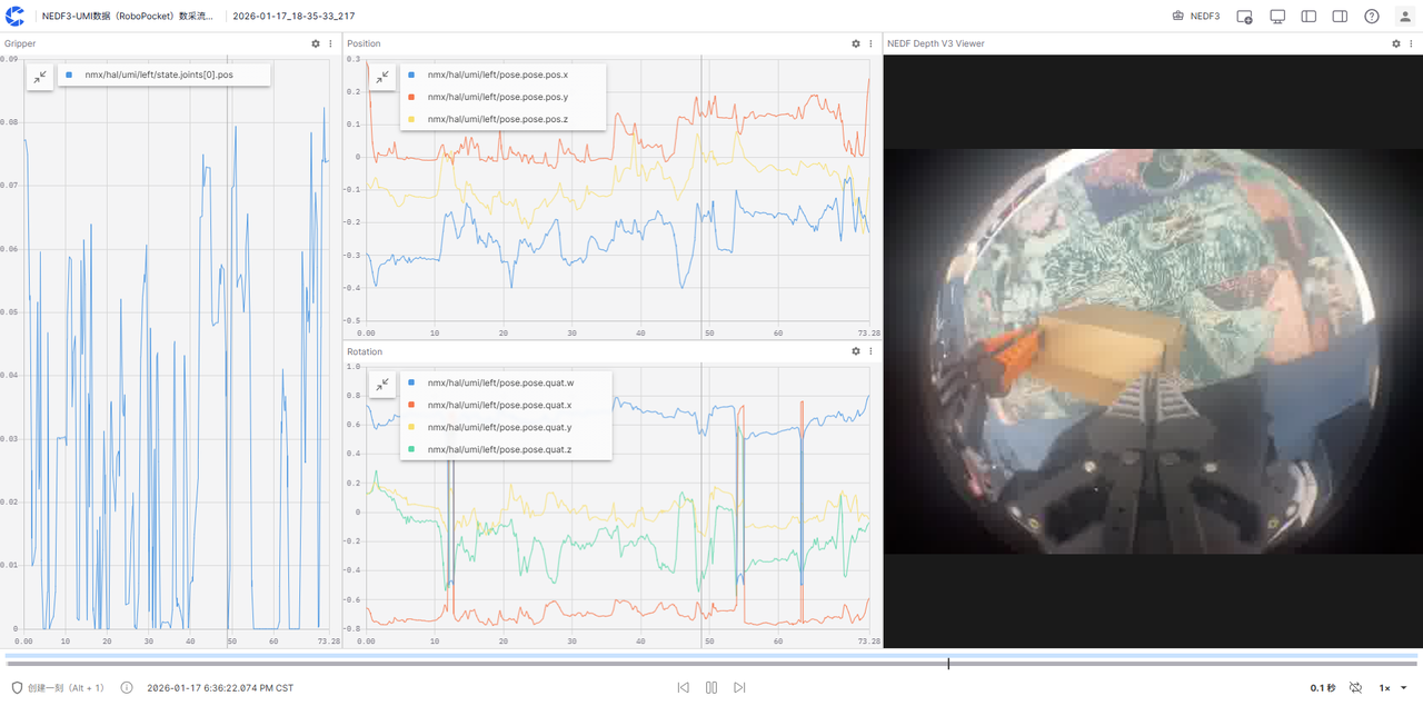 - 录制时同步采集:RGB 视频 + 深度 + 每帧 AR 位姿 + 夹爪状态 + 质量问题标签,统一封装到