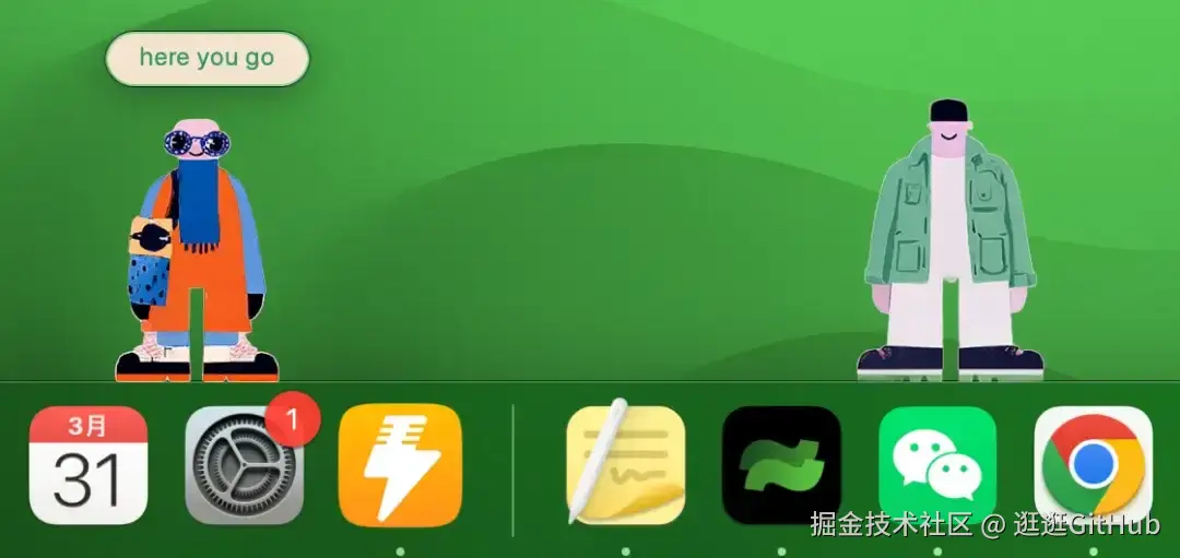 这个项目有两个角色,一个叫 Bruce,一个叫 Jazz,都是像素风格的小动画,会在你 Dock 栏上方走来走去。