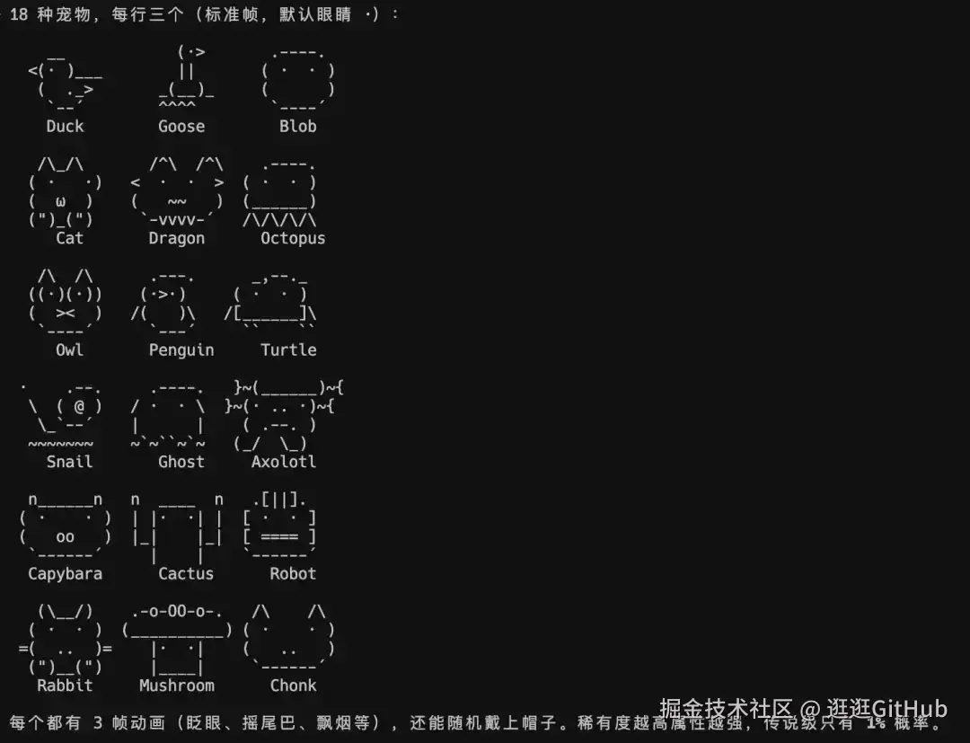 宠物会出现在终端提示符旁边,有闲置动画,会眨眼,还会冒气泡说话。