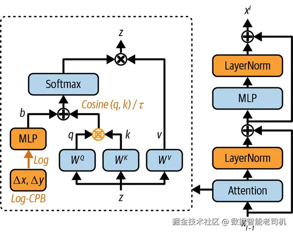 图 3-4. Swin Transformer V2 架构包含多项改进,以更好地扩展模型容量和窗口分辨率:包括 res-post-norm 配置、scaled cosine attention,以及 log-spaced continuous relative position bias。图片改编自 Ze Liu 等人(2022)。