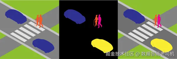 全景分割(panoptic segmentation)把实例分割和语义图像分割结合起来,从而提供对图像的完整理解。它不仅为图像中的每个像素赋予对象类别标签(例如"汽车""道路""行人"),还会区分这些对象的不同实例。这种方法能够对整个场景进行细粒度分割,同时连贯地表示出对象本身以及它们的独立实例。图 3-1 突出了语义分割、实例分割和全景分割之间的区别。