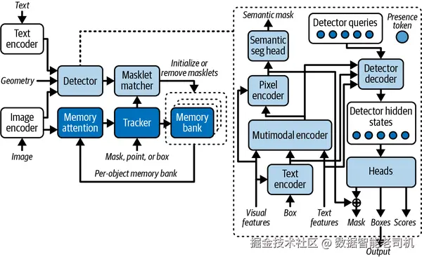 下面这一节会更详细地解释各个组件,说明它们在整体系统中分别起什么作用,以及 SAM 3 是如何在 SAM 2 的基础上扩展出 PCS 能力的。