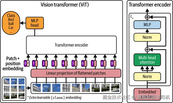 图 3-3. 一张图像会被切成固定大小的 patch,每个 patch 会被线性嵌入,然后再加上位置嵌入,最后把得到的向量序列送入标准 Transformer encoder。对于分类任务,还会额外在序列前加上一个可学习的"classification token"。图片改编自 Alexey Dosovitskiy 等人。