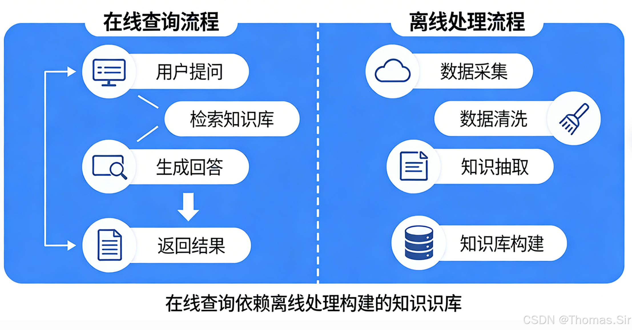 RAG系统的工作流程可以清晰地划分为两个阶段:离线处理阶段 和在线查询阶段。