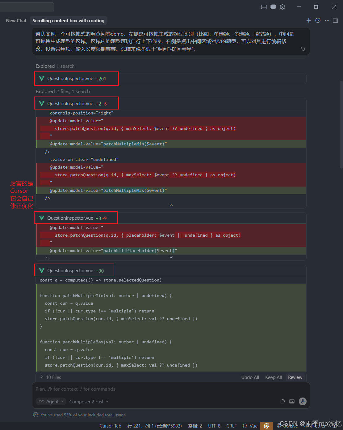 Cursor 在整个实现过程前前后后可能也就不到 10分钟 就完事了,想当初为了实现此功能,先是搜索了大量的Git项目案例,找到合适的项目demo后,又是开始熟悉了解使用方法。