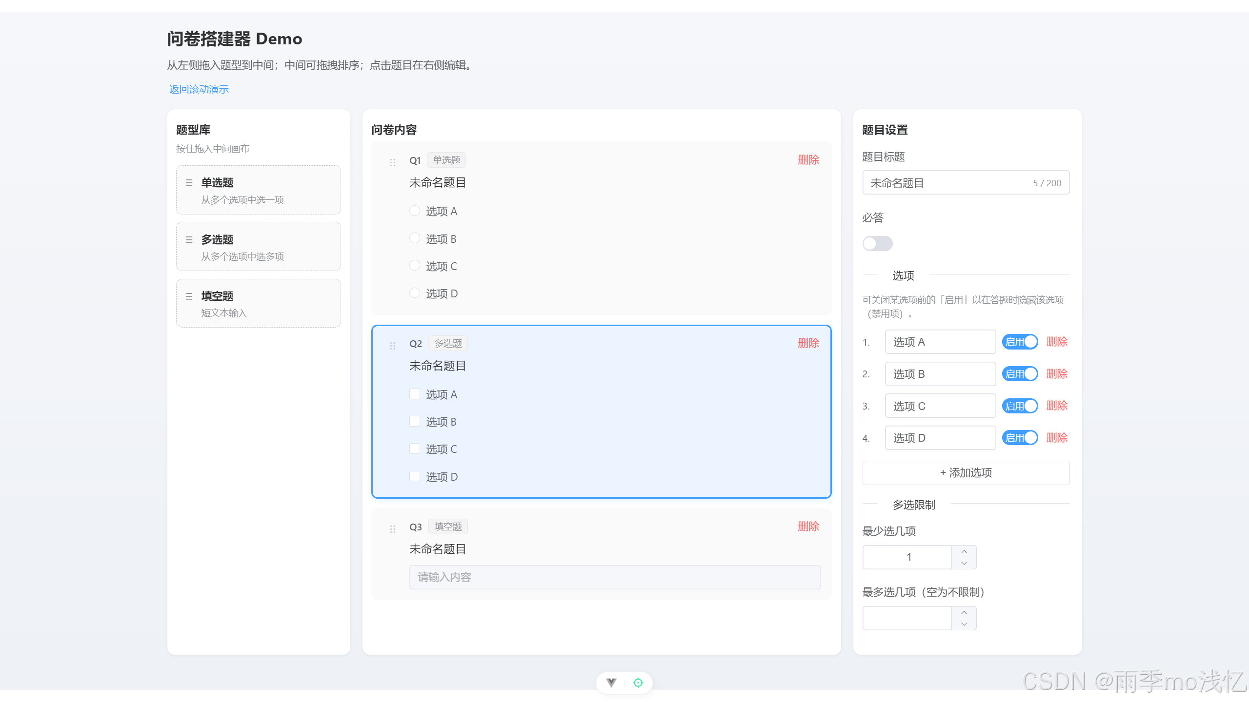 已实现一个可拖拽的问卷搭建 Demo,说明如下。