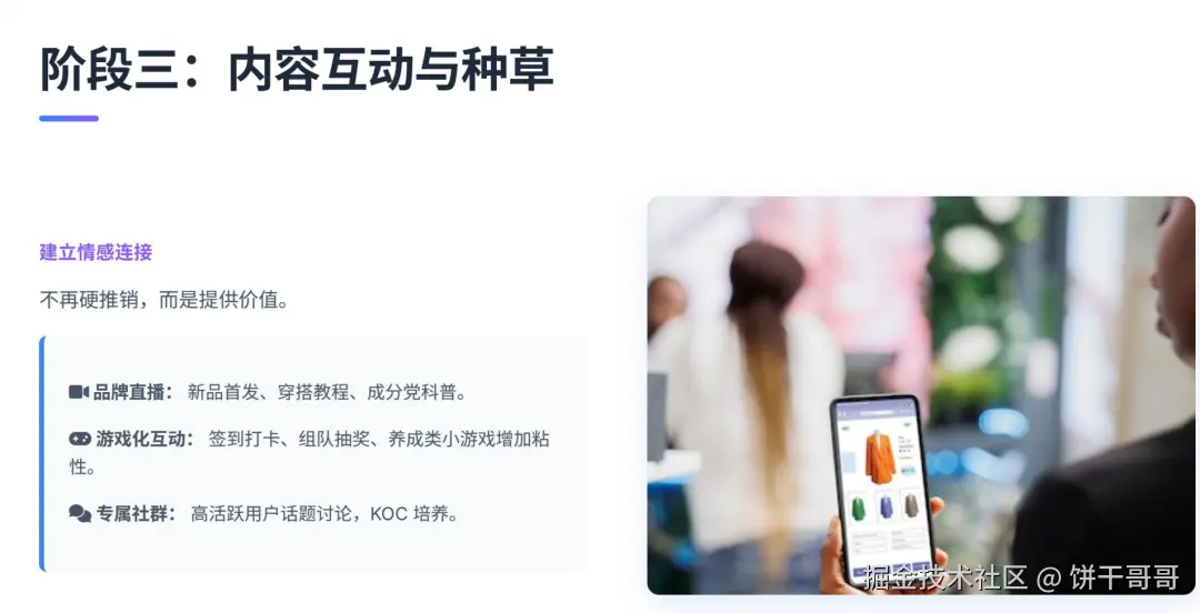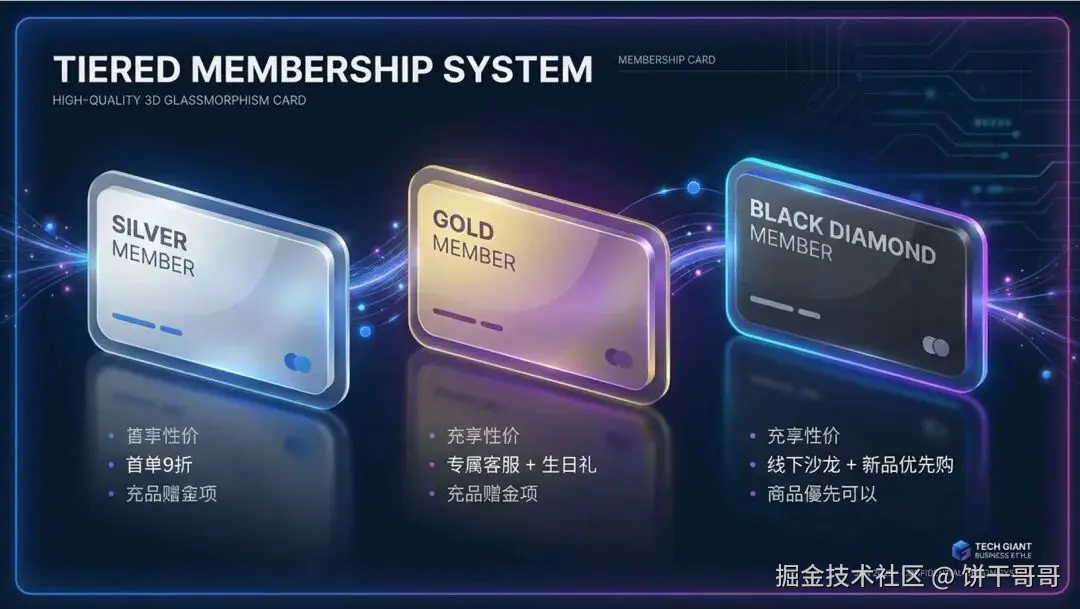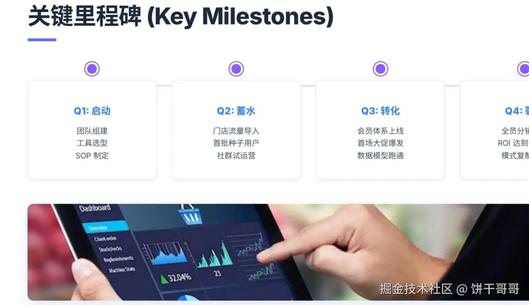 在设计与审美(2.3分)上,它运用了大量的发光霓虹线框、玻璃拟态和 3D 渲染,视觉效果拉满,完全达到了发布会级别的主视觉标准。内容专业度(2.1分)上也构建了完整的 SOP 流程和 RFM 模型,展现了极强的方案架构能力。