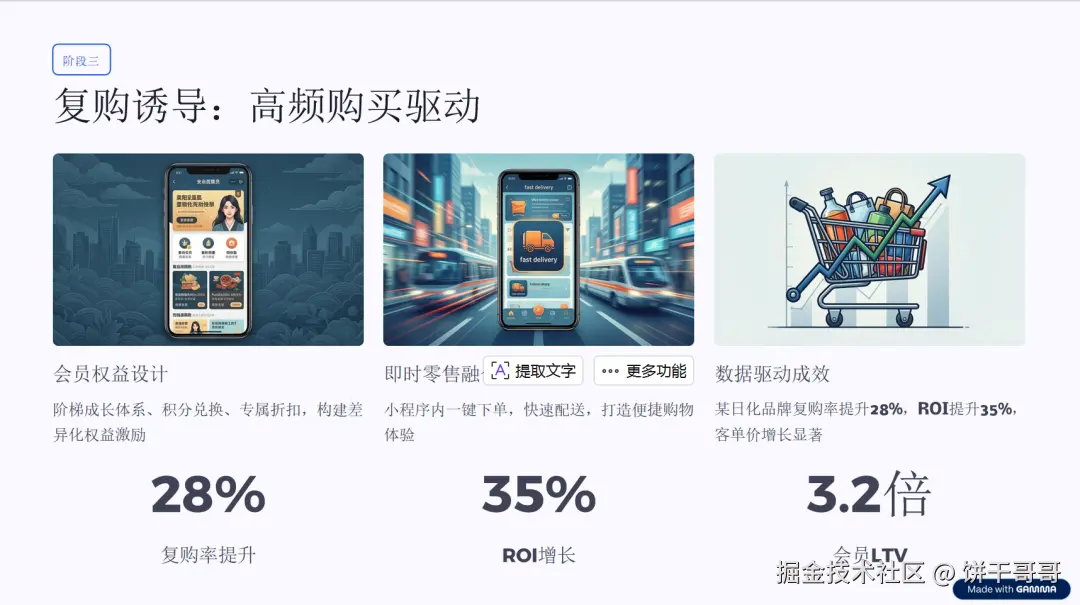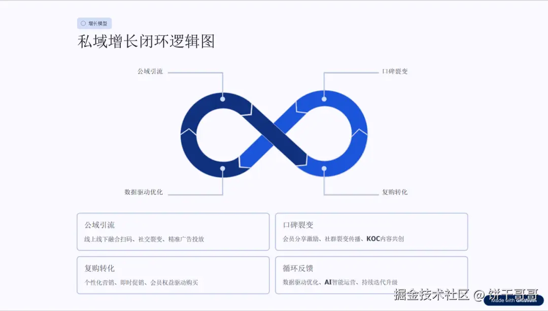 然而,这一切在导出后都归零。PPT 导出交付(1.0分)会导致所有网页端的高级交互丢失,变成一份呆板的静态幻灯片。图表可视化(1.5分)在视觉上很「贵」,但增长闭环图只是通用的无限循环符号,缺乏针对私域流量的具体逻辑路径。