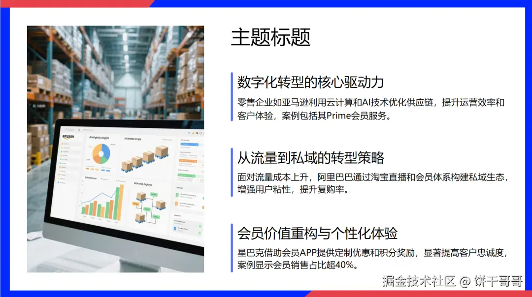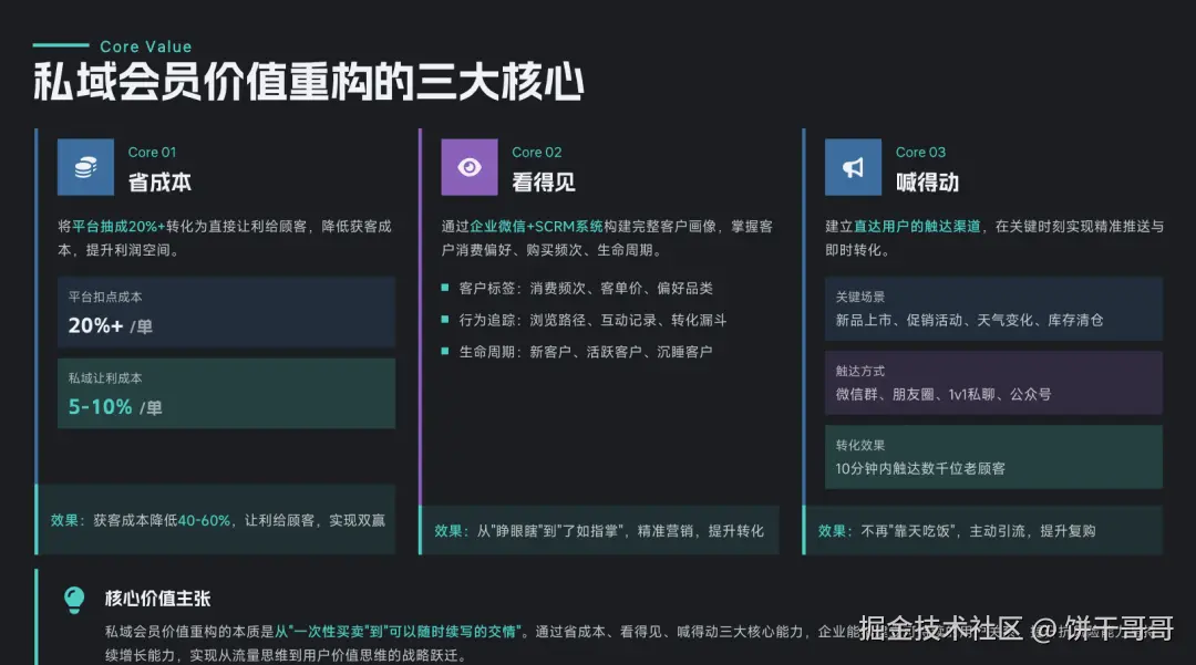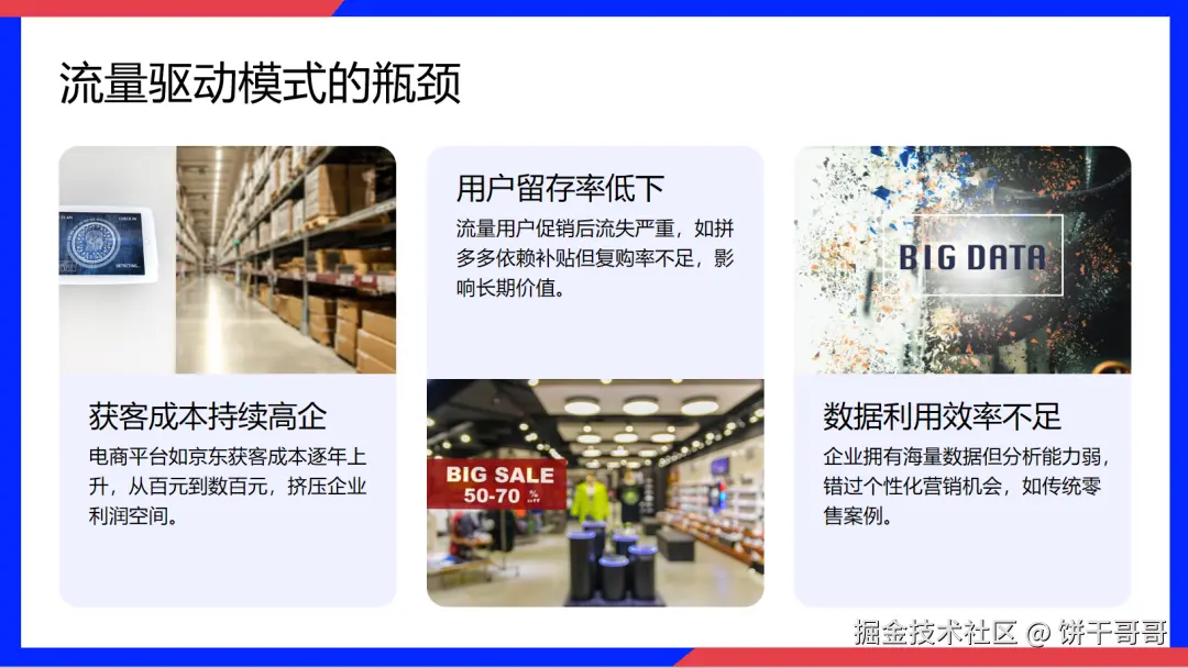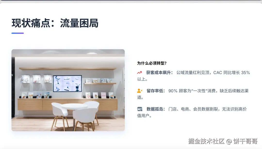 它是所有选手中,内容专业度(2.6分)最高的。它敢于给出具体指标,明确指出了「公域转私域成本突破 100元/人」、「转化流失率高达 70%」。这种数据颗粒度,才是商业 PPT 该有的样子。