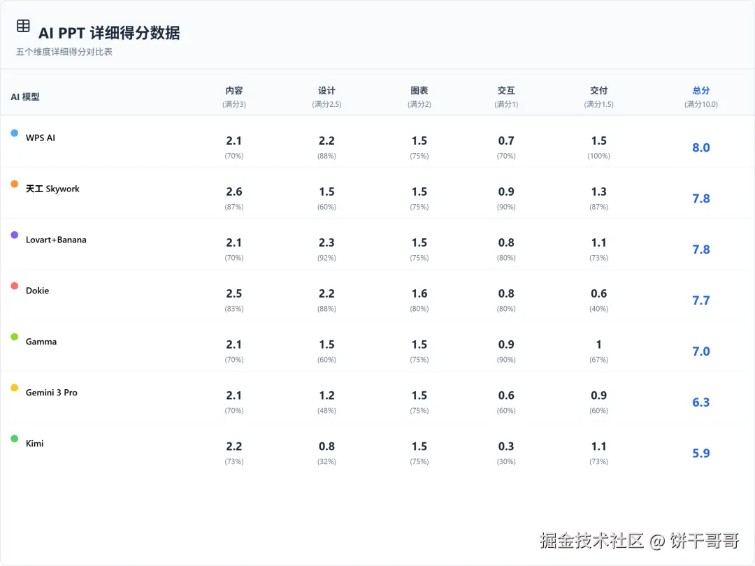 - 设计与审美(权重 2.5): 商务场景不需要花哨,需要的是秩序感。配色是否高级、字体是否对齐、有没有那种廉价的 AI 塑料感。