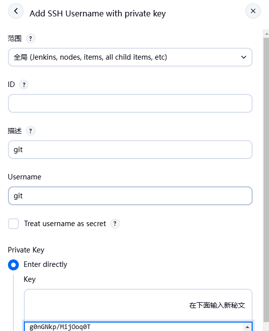 - 这里我们使用的是秘钥认证方式,由于jenkins是通过docker compose管理容器,**推荐在宿主机上生成密钥对,然后挂载到容器中,**公钥配置到git仓库SSH配置中,私钥粘贴到下图Key中,这样jenkins就可以免交互的拉取git仓库 中的代码了。