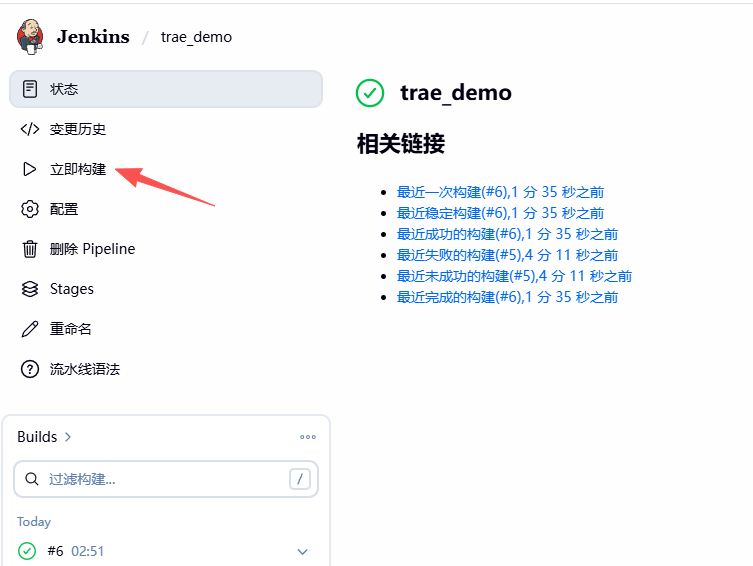agent anystages { stage('拉取代码') { steps { git( url: 'git@codeup.aliyun.com:xxxx.git', branch: 'master', credentialsId: 'codeup-xxxx' // 你在 Jenkins 中创建的凭证ID ) } } stage('构建') { steps { sh 'echo "开始构建..."' // 你的构建命令,例如: // sh 'mvn clean package' // sh 'npm install && npm run build' } } stage('测试') { steps { sh 'echo "运行测试..."' // sh 'mvn test' // sh 'npm test' } } } post { success { echo 'Pipeline 执行成功!' } failure { echo 'Pipeline 执行失败!' } }}