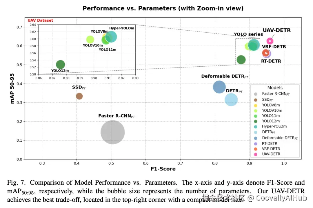 UAV-DETR以11.96M参数(减少约40%)实现了62.56%的mAP50:95(+6.61个百分点),在自建数据集和DUT-ANTI-UAV公开基准上均优于RT-DETR和多个YOLO变体。