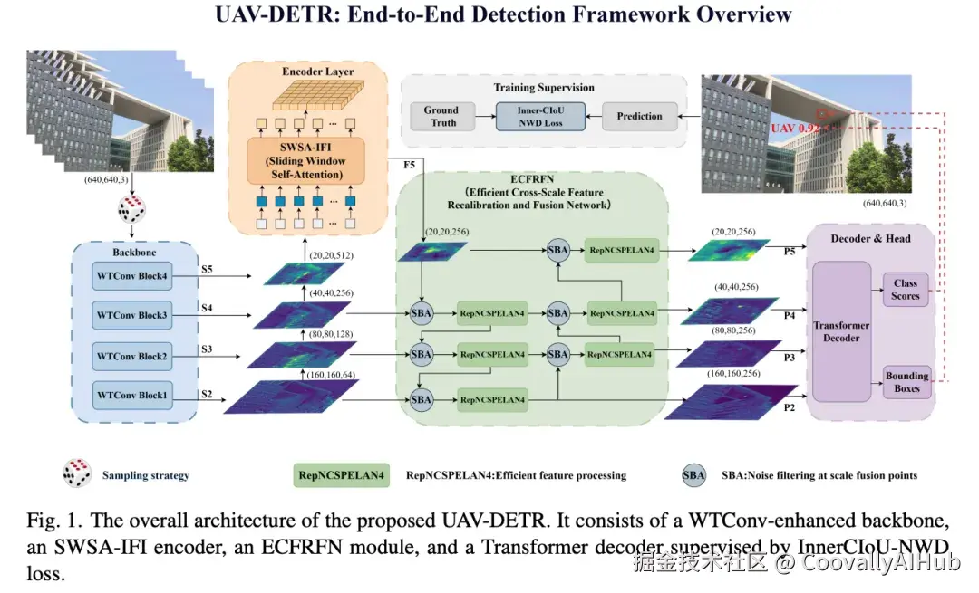 西北工业大学团队提出UAV-DETR,在RT-DETR基础上做了四项针对性改造------用小波变换卷积替换骨干网络的标准卷积以保留小目标高频细节,用滑动窗口自注意力替换全局注意力以避免小目标特征被淹没,引入跨尺度特征融合模块增强多尺度表达,并设计InnerCIoU-NWD混合损失解决小框梯度不足的问题。在自建的14,713张反无人机数据集上,UAV-DETR以11.96M参数(比RT-DETR减少约40%)实现了62.56%的mAP50:95(比RT-DETR提升+6.61个百分点),Precision 96.82%、Recall 94.93%均为所有对比方法中最高。在公开基准DUT-ANTI-UAV上同样验证了一致的改进。