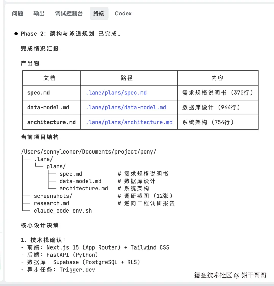 它没有急着写代码,而是先创建了一个 /.lane/plans/ 目录,强制要求先完成三个文件:需求规格说明书、数据库模型设计、系统架构图。