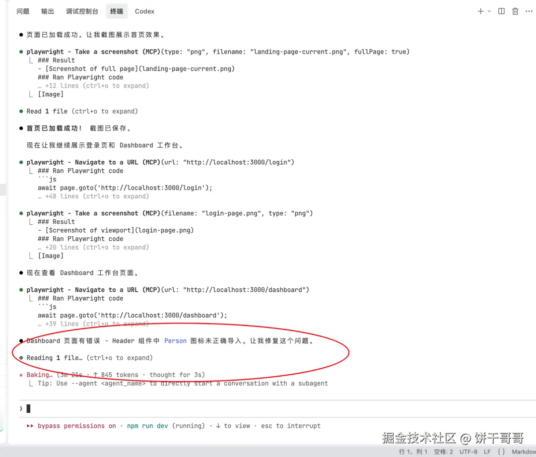 我什么都没做,它自己读取了报错日志,分析是 Header 组件引入图标失败,然后自己修改了代码,重新运行。