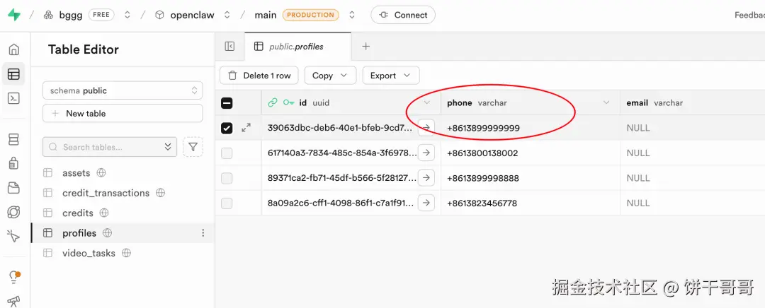 它不仅是建了几个表,而是写了完整的 SQL Migration 文件。它设计了 profiles(用户)、credits(积分)、video_tasks(任务)等 12 张核心表。