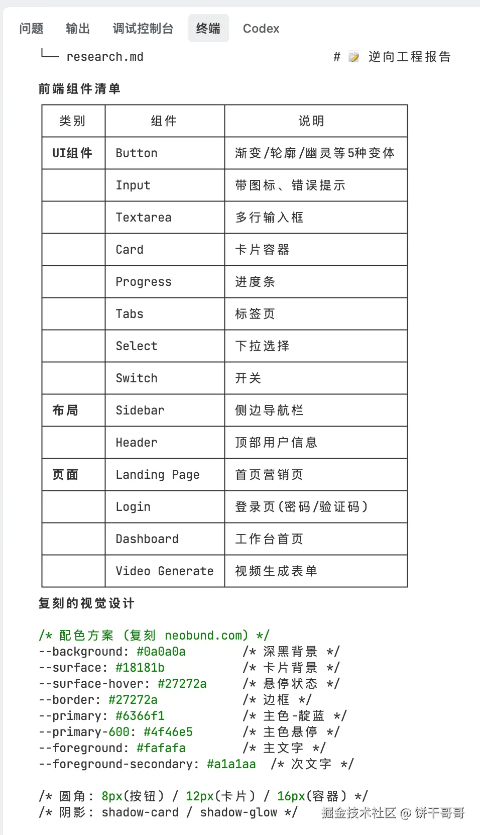 - 视觉分析:通过 DOM 结构,反推出了 Tailwind CSS 的色值、圆角大小和阴影风格。