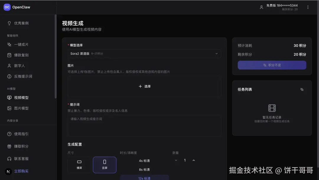 - 积分系统:注册送 20 积分,生成视频扣除积分,余额不足报错。