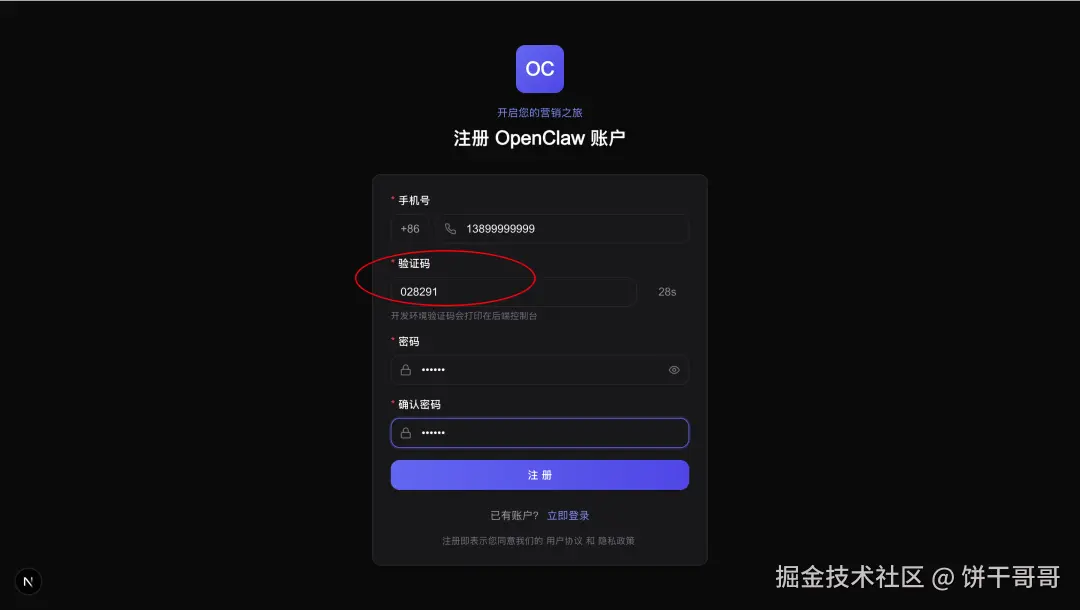目前验证码是放到后端显示,填入后就能顺利注册