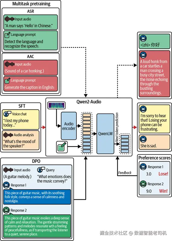 虽然 Whisper 至今仍然被很多 SOTA 模型用作编码器,但我会把重点转向更新一代的音频基础模型。这些模型可以在同一套架构中处理多种任务。它们通常被称为大型音频---语言模型(LALM),其中包括 Qwen2-Audio 和 Kimi-Audio。这类模型已经不再局限于单任务处理,而是展示出跨识别、生成、分类和音频---语言对齐的统一能力。本章也会介绍基于 Transformer 的音乐生成模型,并展示如何通过文本来生成在长程结构与风格控制上都更加连贯的音乐序列。