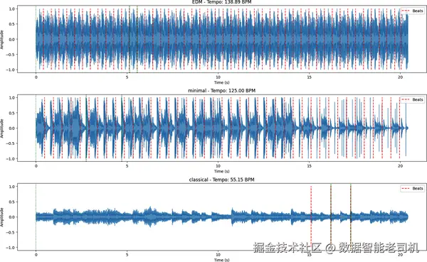 图 6-2. 不同音乐类型会展现出不同的波形结构。图中展示的是 EDM、极简 techno 和古典音乐的 20 秒片段。它们的节奏和韵律模式差异明显:EDM 有快速而稳定的脉冲;极简 techno 更偏 groove,振幅变化更动态;古典音乐则呈现出更流动、低节奏、细微动态更丰富的结构。这些差异正是 Transformer 模型可以学习、识别、分类,甚至在适当表示下复现的内容。