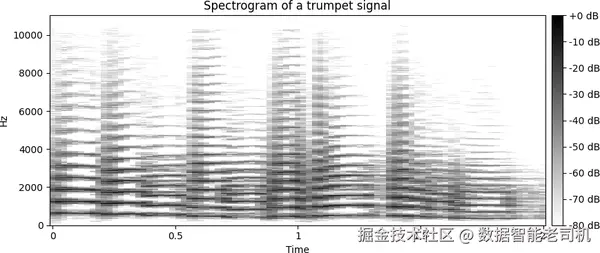 其中, <math xmlns="http://www.w3.org/1998/Math/MathML"> w [ n ] w[n] </math>w[n] 是窗函数,例如 Hanning window,而 <math xmlns="http://www.w3.org/1998/Math/MathML"> m m </math>m 表示窗口位置索引。Hanning window 是一种平滑的钟形函数,用来作用在信号片段上,从而减少边界不连续性,并在 Fourier 分析时尽量降低频谱泄漏。声谱图本质上是一个二维矩阵:横轴表示时间,纵轴表示频率,而颜色强度表示幅度。图 6-4 展示了一个小号信号的声谱图,可以看到它的频率内容是如何随时间变化的。
