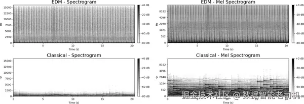 图 6-1. EDM 与古典音乐 20 秒片段的对比,每个片段都分别展示了线性声谱图(左)和 mel 声谱图(右)。