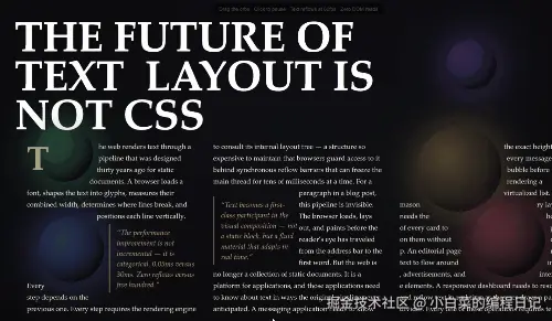 Pretext 是一个纯 JavaScript 文本测量库,通过 Canvas API 缓存字符宽度,支持在不改动 DOM 的情况下快速计算文本高度和行数。适合虚拟列表、动态排版等性能敏感场景。