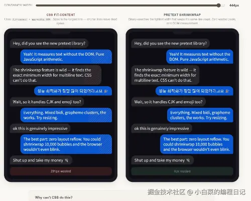 Pretext 的解决方案: 用 Canvas API 一次性测量所有字符宽度,后续计算纯算术完成,不触发布局回流。