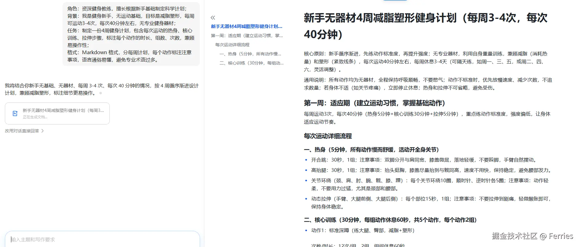 很多人让 AI 生成健身计划表时,提示词过于简单(如"帮我写个健身计划"),导致输出的计划不贴合自身情况(比如忽略健身基础、目标)。结合我们前面讲的结构化表达,优质提示词应包含以下核心要素: 当我给一个简单提示词的结果如下