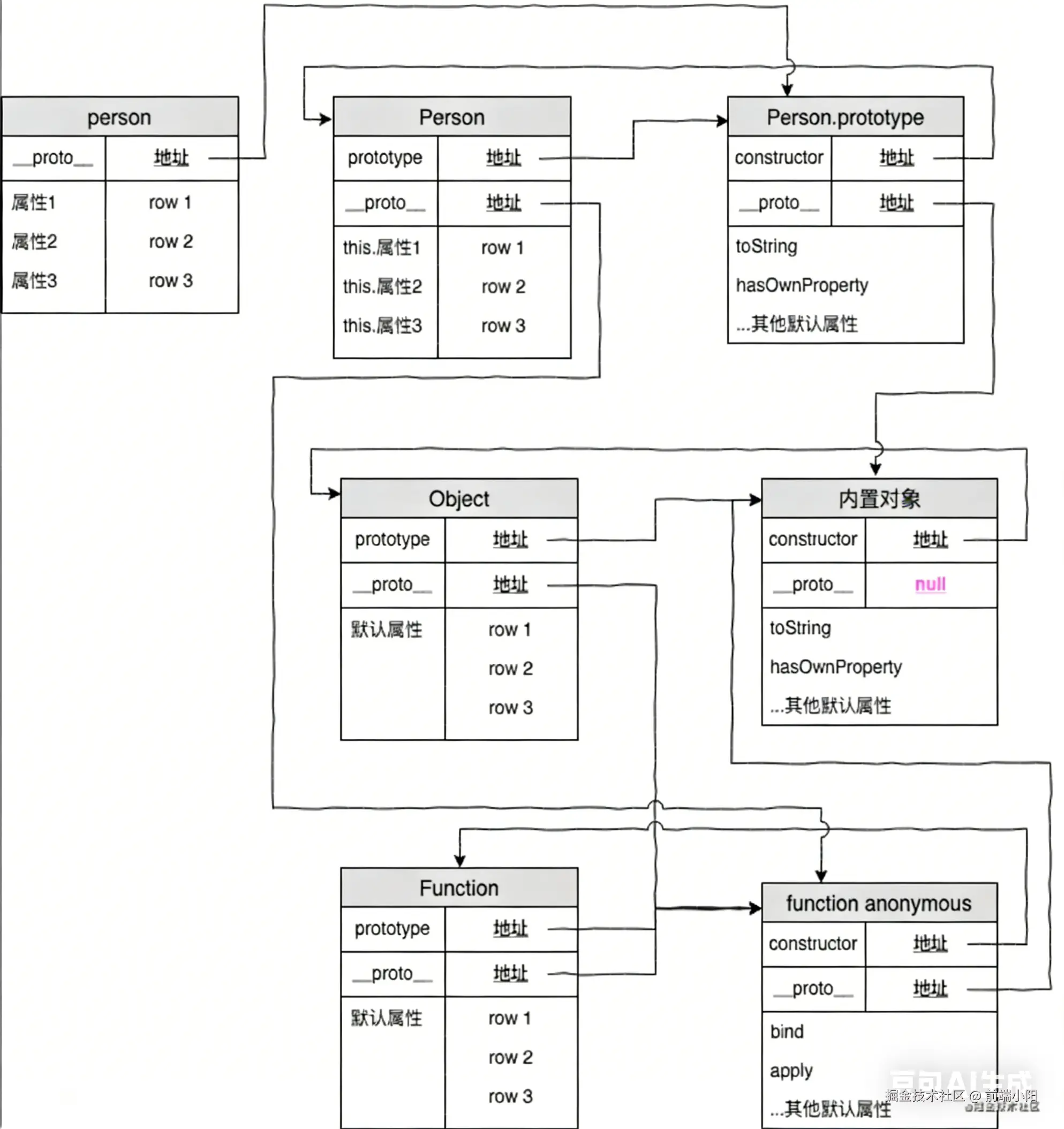 Person.prototype,存放着Person的函数方法。 __proto__:当person想使用Person中的函数方法时,就会通过隐式原型__proto__顺着原型链指向Person.prototype来使用其方法。- 而在