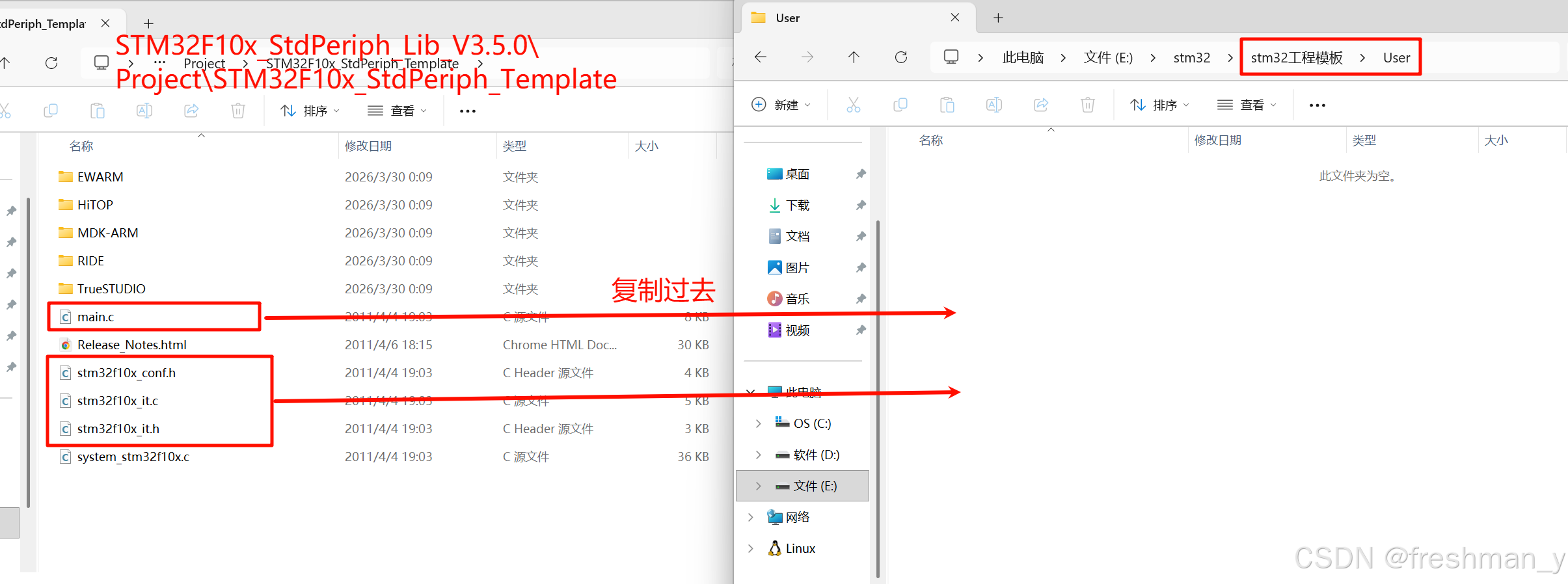 中的main.c 和 conf 头文件以及两个 it 文件复制到stm32工程模板的User文件夹下
