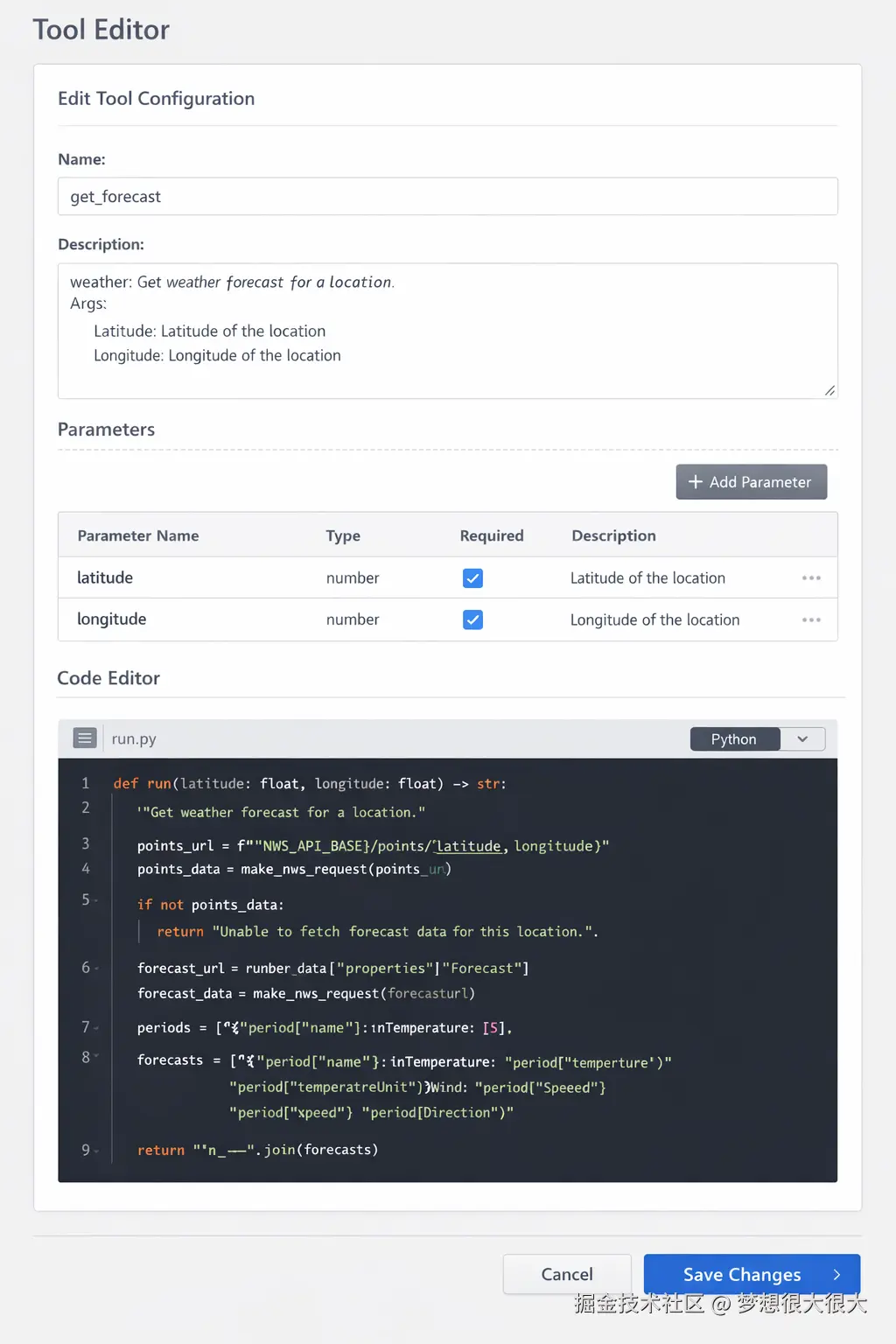 目前为了简化演示,我们使用 tools.json 文件来模拟数据库,存储所有的 Tool 配置。实际项目中 ,你完全可以把这些数据存入 MySQL、PostgreSQL 或 MongoDB 等数据库中,甚至进一步开发一个 Web 可视化配置管理系统(包含表单 + 在线代码编辑器),让用户可以通过界面轻松新增、编辑和删除 Tool。