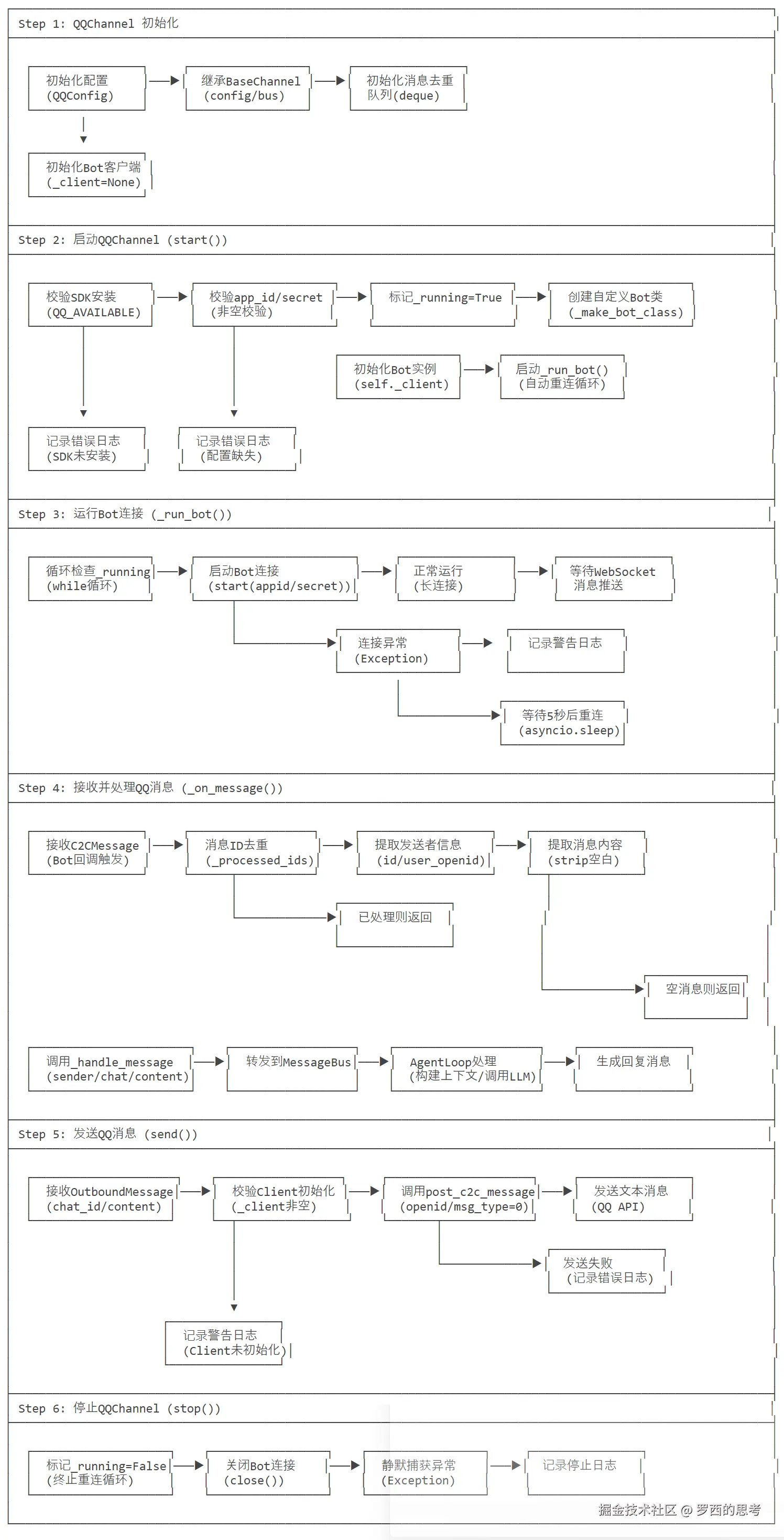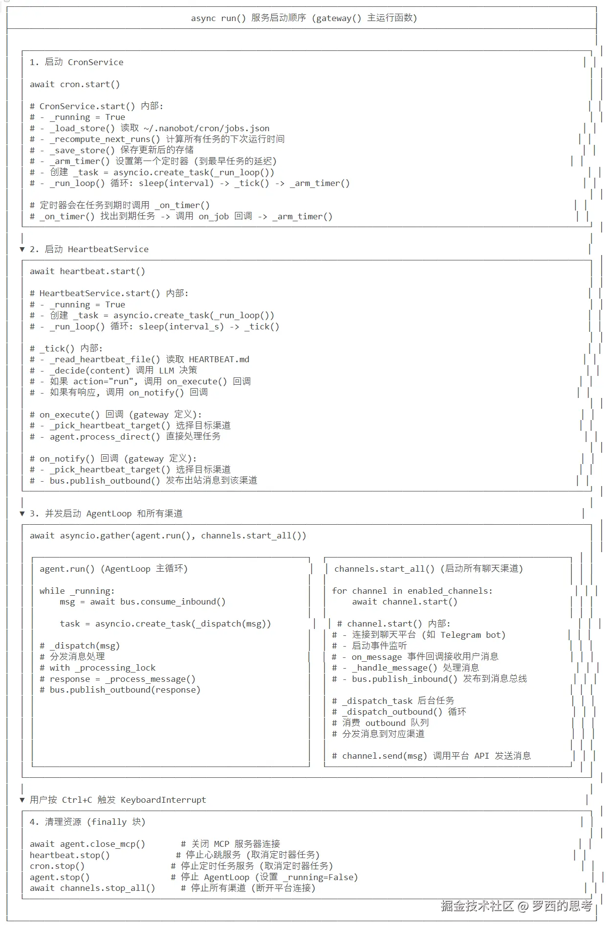 - 服务类命令(如gateway):启动长期运行的主服务进程; 初始化并启动所有核心组件:MessageBus、Agen tLoop、ChannelManager等;持续运行直到手动停止,处理来自各渠道的消息;示例:nanobot gateway → 启动webSocket连接 → 持续监听消息 → 长期运行