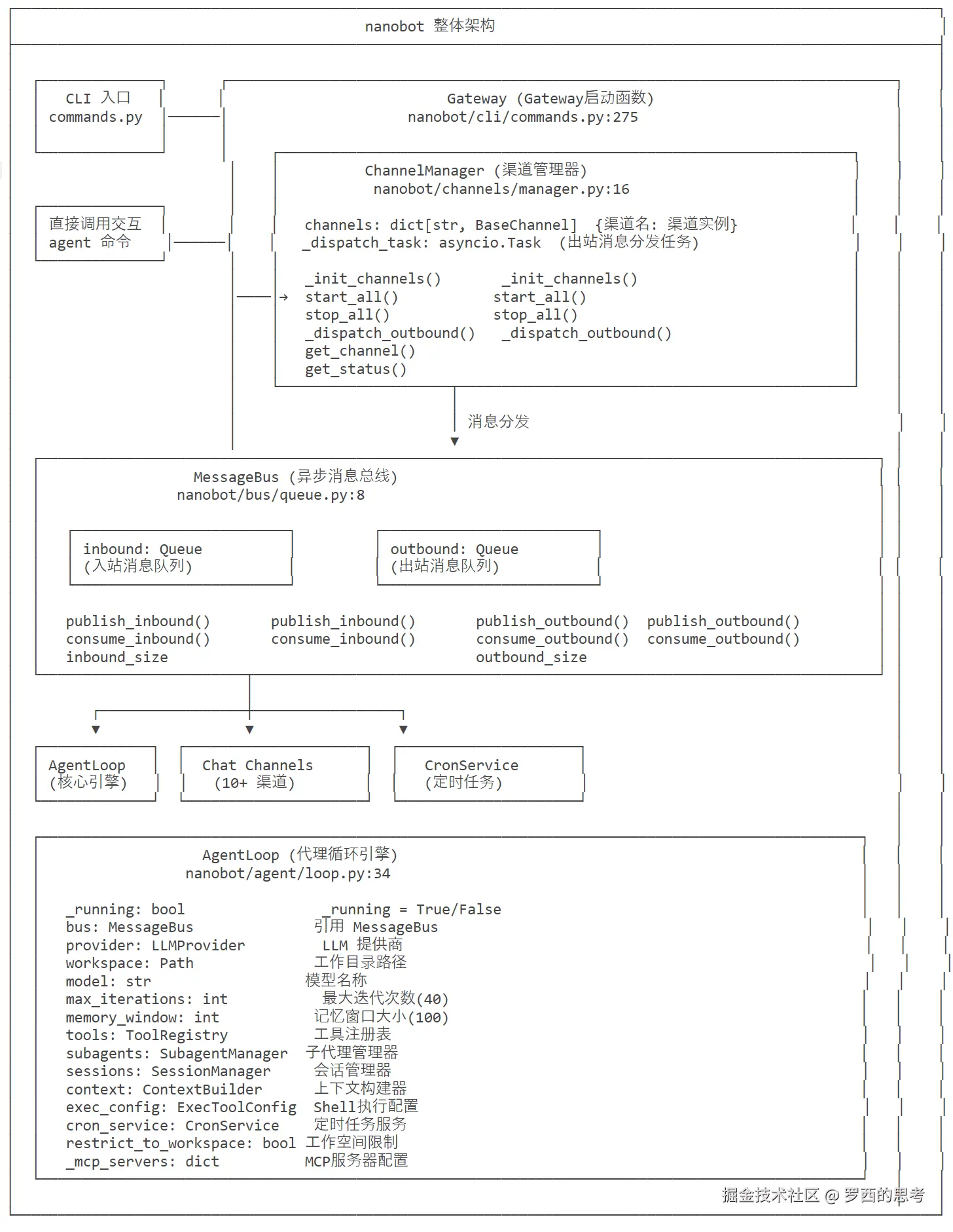 在 Nanobot 中,如下几个主要组件担任了外层控制架构,各组件职责为: