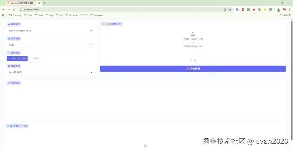 和之前的fast whisper一样的界面,选择模型,选择gpu,上传音频,点击转录