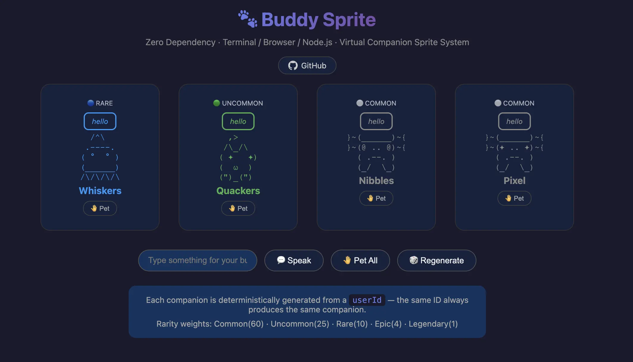 import { BuddyEngine, assembleCompanion } from 'buddy-sprite'