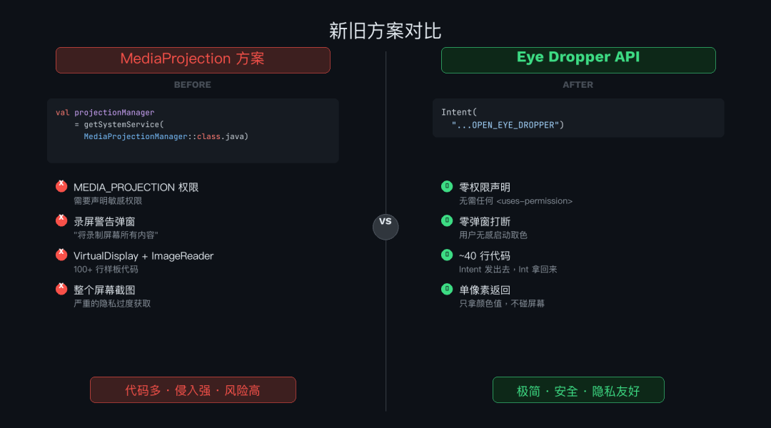 • 零隐私风险:App 只拿到一个颜色值,无法窥探屏幕内容