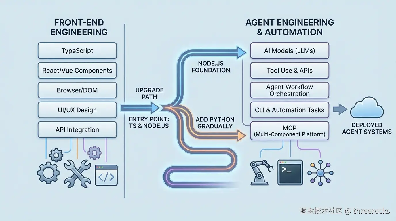 我最近越来越明确的判断是,前端出身的人想往 Agent 工程师走,最低阻力路线就是先把 TS 打穿,把 Node.js 用深,把模型、工具、工作流这些能力一点点接到自己熟悉的工程体系里。Python 当然要学,我也不觉得它不重要,但顺序很关键。对现阶段的我来说,它更像后续补强,而不是一开始就该切过去的主战场。