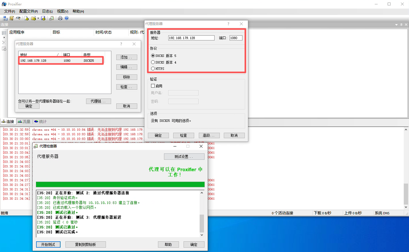 服务器地址为Kali机IP(192.168.179.128),端口号为1080,协议类型为SOCKS5。