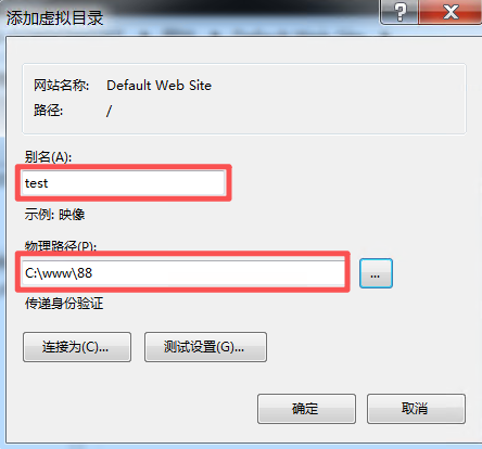 说明:图中的别名是指网站的路径名,当别名设为test之后,那么对应的访问路径是http://10.10.10.11/test/。物理路径是指网页文件存放的位置。这两者都可以自定义!