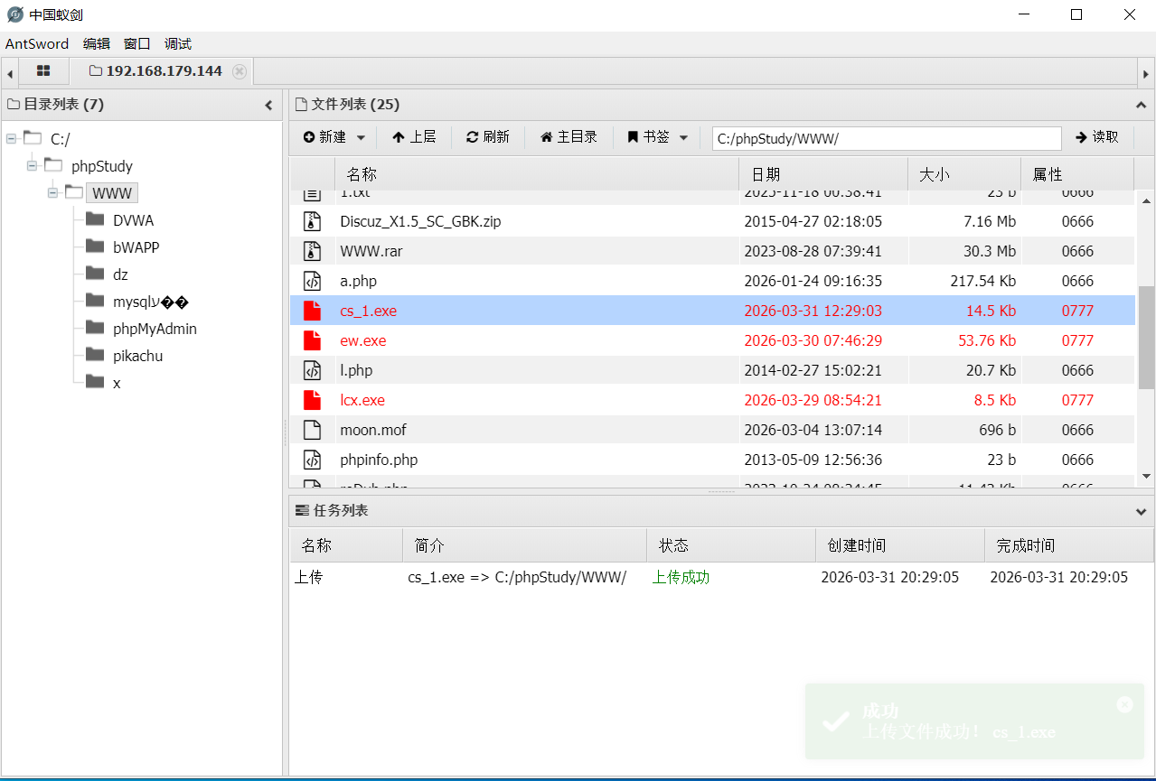 将保存好的文件(cs_1.exe)通过蚁剑上传至目标服务器。