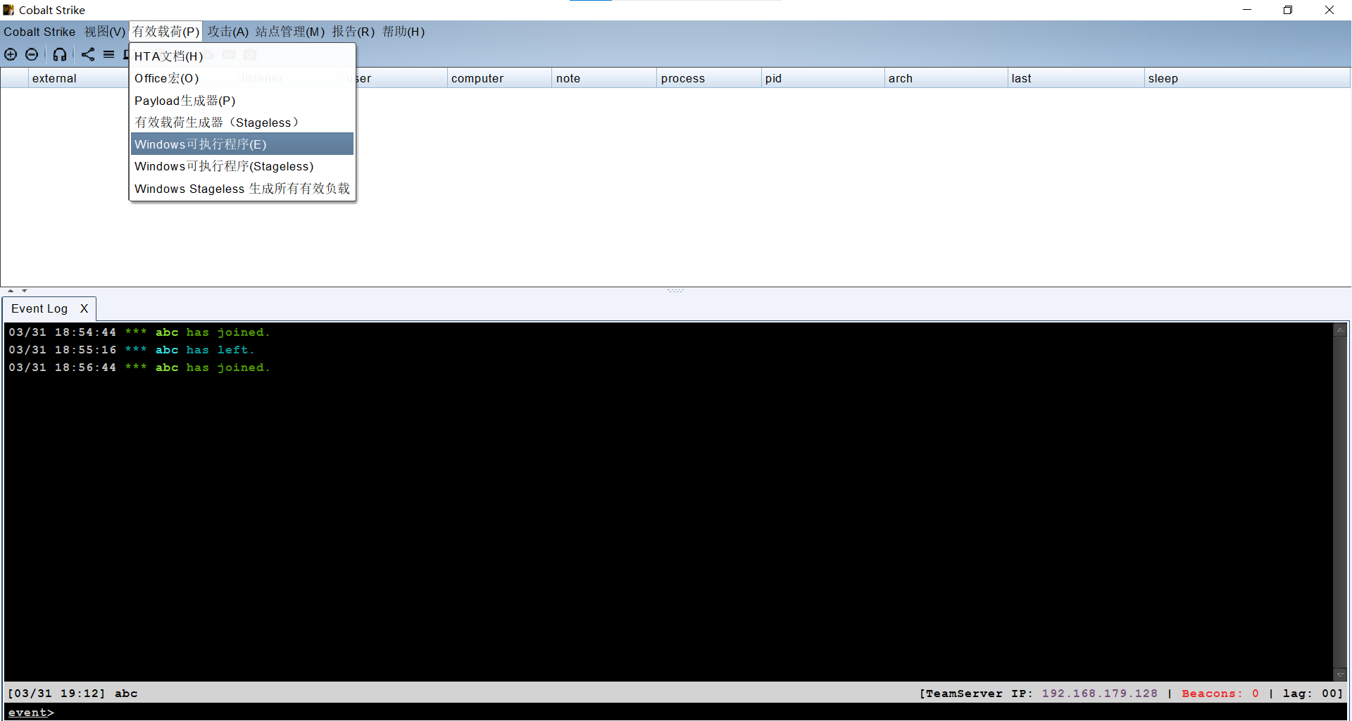 $ sudo ./teamserver 192.168.179.128 test #启动teamserver(服务端)IP地址为kali的地址,test为连接密码