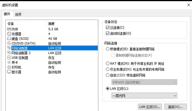 Step1 :在Vmware中的网卡配置,设置"网络连接"为"LAN区段",并添加区段为"一层内网"。
